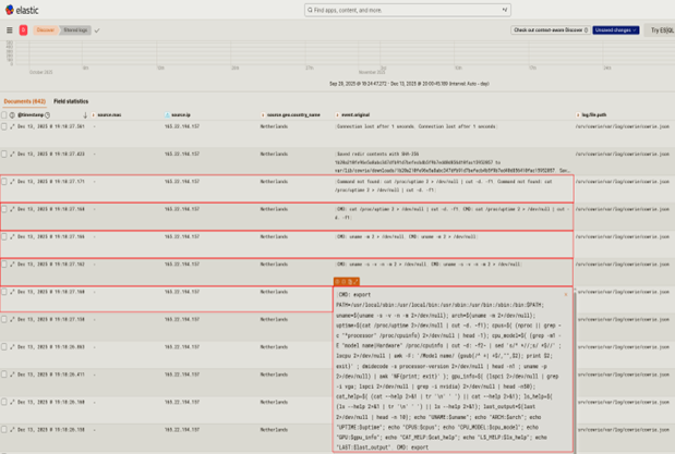 At this stage, the threat actor already has access (this resulted from SSH spraying), and they are enumerating the machine for kernel info, system architecture, uptime, CPU model and capabilities, GPU info, binary versions, and login info. They then output all of this information in a standardized format to be parsed, either via an automated process or handed off to someone to start building persistence/determining if the system is suitable for the botnet.